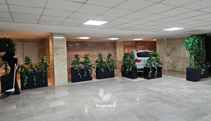 در این پروژه که برای پارکینگ یک مجتمع مسکونی در محله پونک تهران اجرا شد، از فلاورباکس فایبرگلاس استفاده کردیم؛ با ترکیب بهترین گونههای گیاه مصنوعی که از نظر ظاهر، تفاوتی با گیاه طبیعی ندارند. فضای پارکینگ بهدلیل نور کم، امکان نگهداری گیاه زنده را نداشت، اما این محدودیت دلیلی نبود تا از رنگ سبز و حس طراوت طبیعت چشمپوشی کنیم.